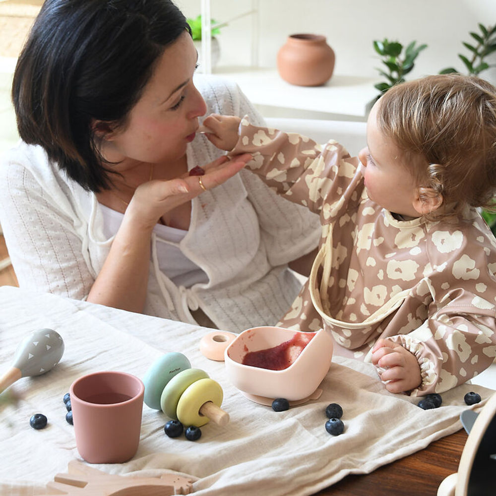 It consists of the essential tableware for first meals with its four pieces: a plate and a bowl with suction cups, a small cup, and a second-stage silicone spoon. The suction cup under the plate and bowl allows them to be secured to the table or highchair tray, preventing accidents and spills. The discreet tab enables parents to lift the plate and bowl easily when the meal is finished